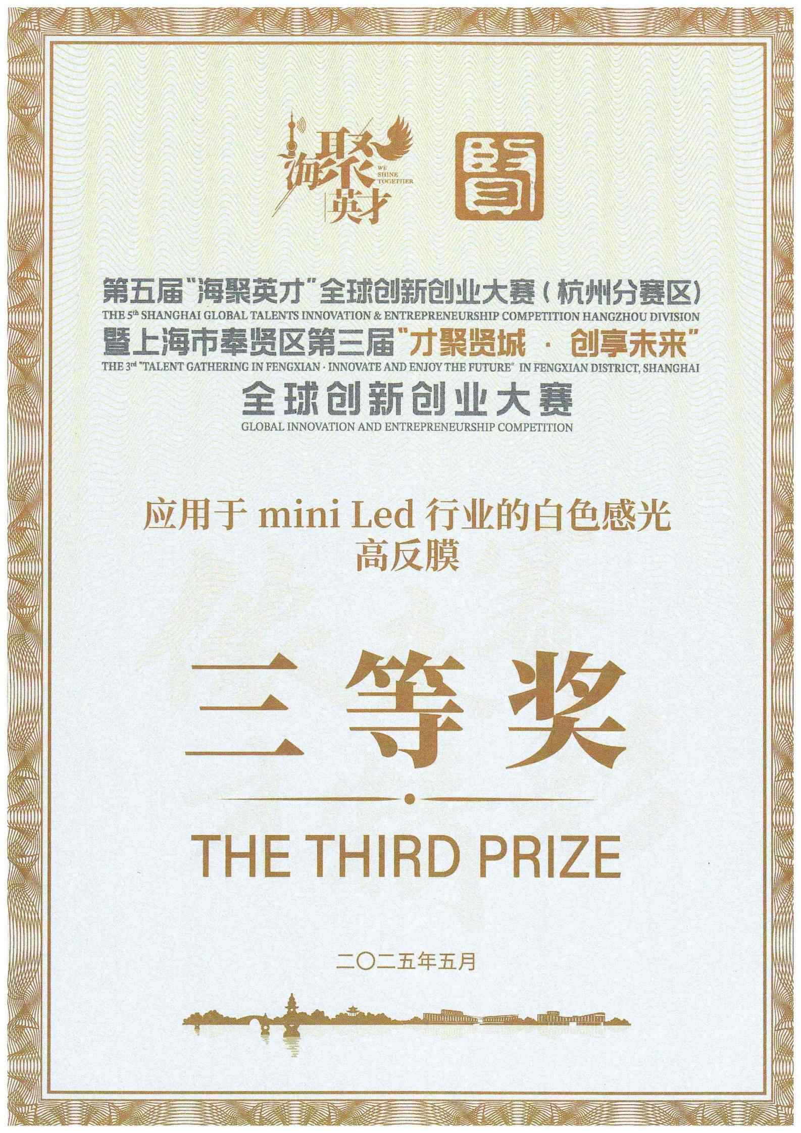祝贺金博士的一项创新项目“应用于mimi Led行业的白色感光高反膜”在第五届“海聚英才”全球创新创业大赛(杭州分赛区)暨上海市奉贤区第三届“才聚贤城·创享未来”全球创新创业大赛上荣获三等奖。